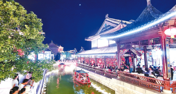 6月15日,漫步皇家驿站运河西街,斑斓的光影和飘渺的烟雾在河岸上交织,不时有游船乘波而上,两岸商铺鳞次栉比,许愿牌随风摇曳,熙熙攘攘的游客纷纷来此打卡夜生活,感受不一样的天中烟火气,享受着独属夏夜的清凉。(记者 杨 森)[详细]